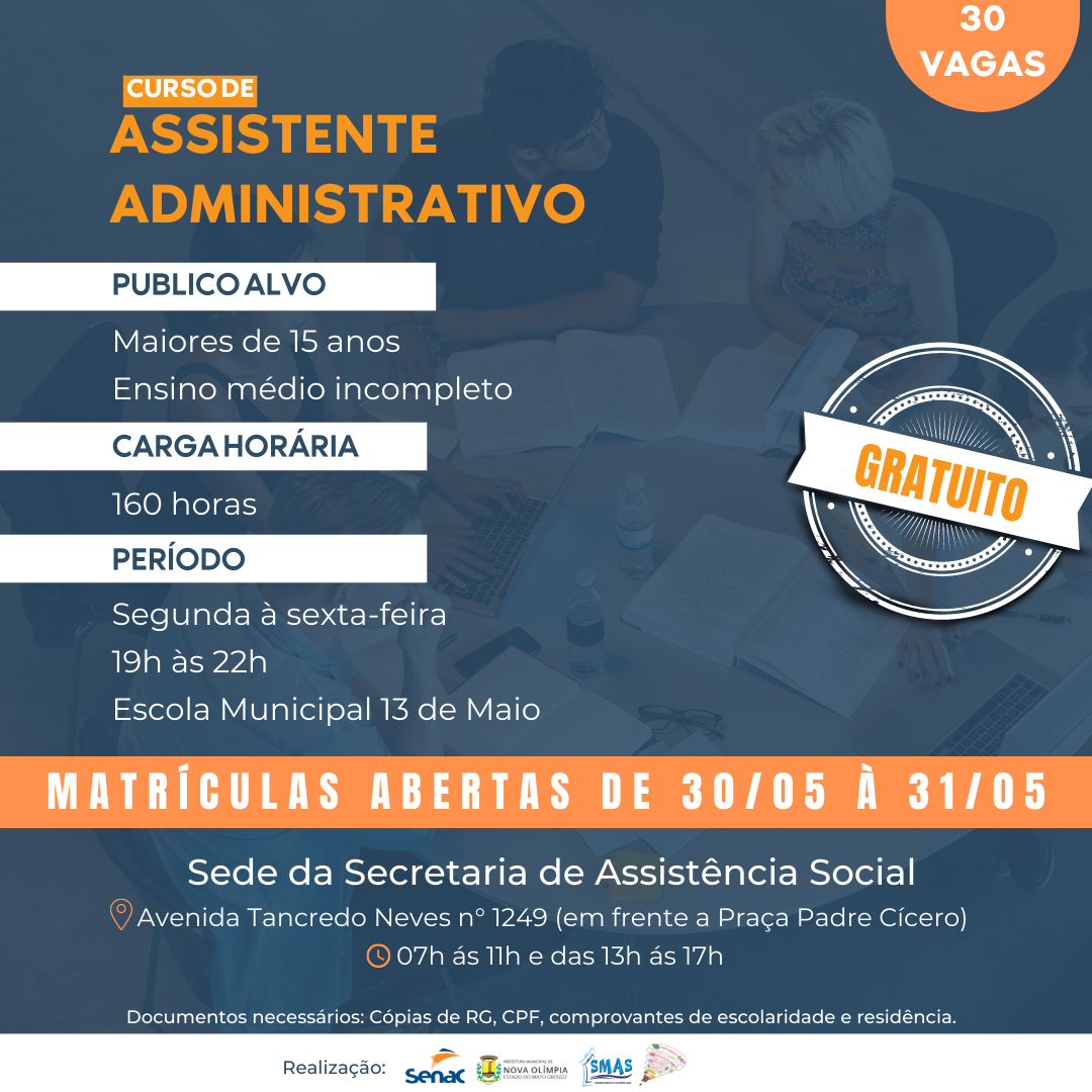 A Prefeitura Municipal de Nova Olímpia, através de uma parceria entre as secretarias de Assistência Social e de Educação com apoio do SENAC, abre 30 vagas para o Curso de Assistente Administrativo.