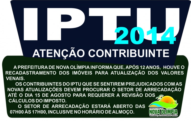 OS CONTRIBUINTES DO IPTU QUE SE SENTIREM PREJUDICADOS COM AS NOVAS ATUALIZAÇÕES DEVEM PROCURAR O SETOR DE ARRECADAÇÃO ATÉ O DIA 15 DE AGOSTO PARA REQUERER A REVISÃO DOS CALCULOS DO IMPOSTO.
