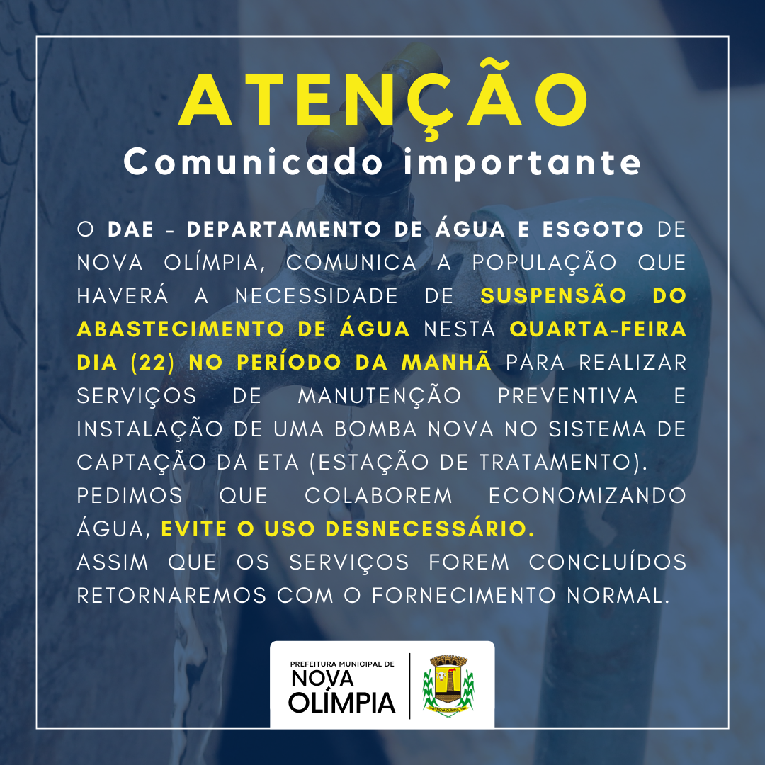 Para que seja mantida a regularidade e qualidade no abastecimento de água em nosso município, informamos a população de Nova Olímpia da necessidade de realizar ações de manutenções preventivas no sistema de captação do córrego Mineiro e instalação de uma bomba nova. Os serviços ocorrerão na manhã desta quarta-feira (22) de setembro. O objetivo é evitar a ocorrência de possíveis falhas ou paradas não programadas, que poderiam ocasionar em desabastecimento de água para nossa comunidade.