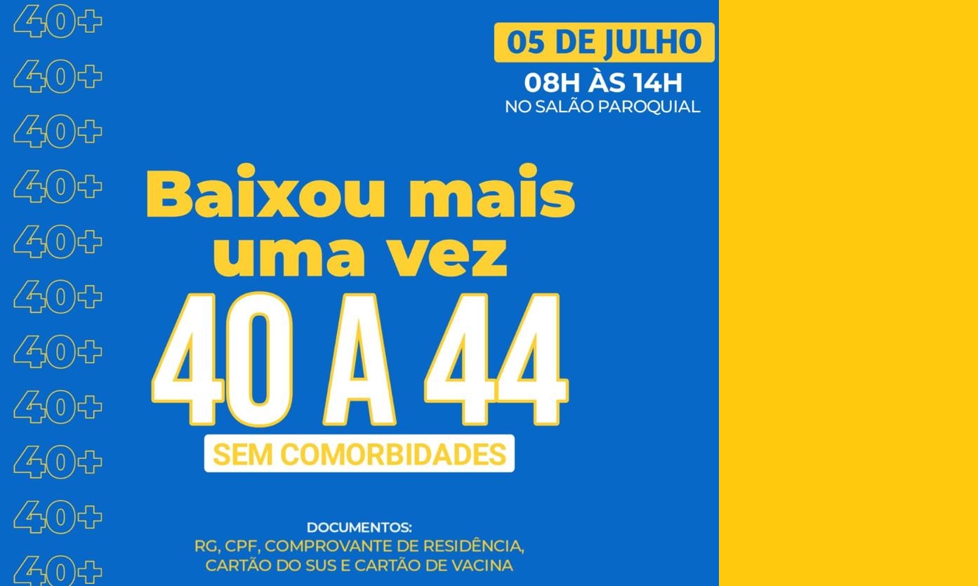 Nesta segunda-feira (05.07), ocorrerá a vacinação de pessoas sem comorbidades que se enquadram na faixa etária entre 40 e 44 anos, seguindo indicações do Plano Nacional de Imunização do Ministério da Saúde contra a Covid-19. O início da vacinação está prevista para às 08h00, no Salão Paroquial da Igreja Matriz