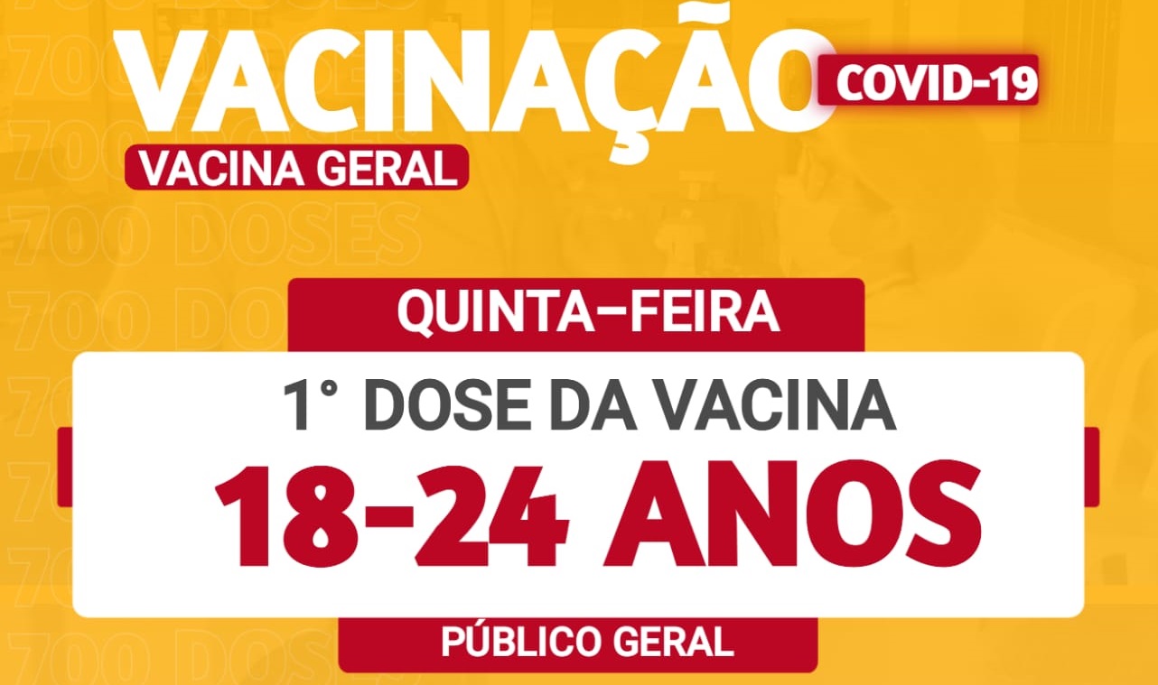 A partir desta quinta-feira (05.08) os jovens da faixa etária de 18 a 24 anos de idade poderão se vacinar contra a covid-19 em Nova Olímpia. As vacinas estarão disponíveis para este público a partir das 13h no salão Paroquial da Igreja Matriz no centro de Nova Olímpia. O município também vai disponibilizar para primeira dose dessa faixa etária 400 doses do imunizante.