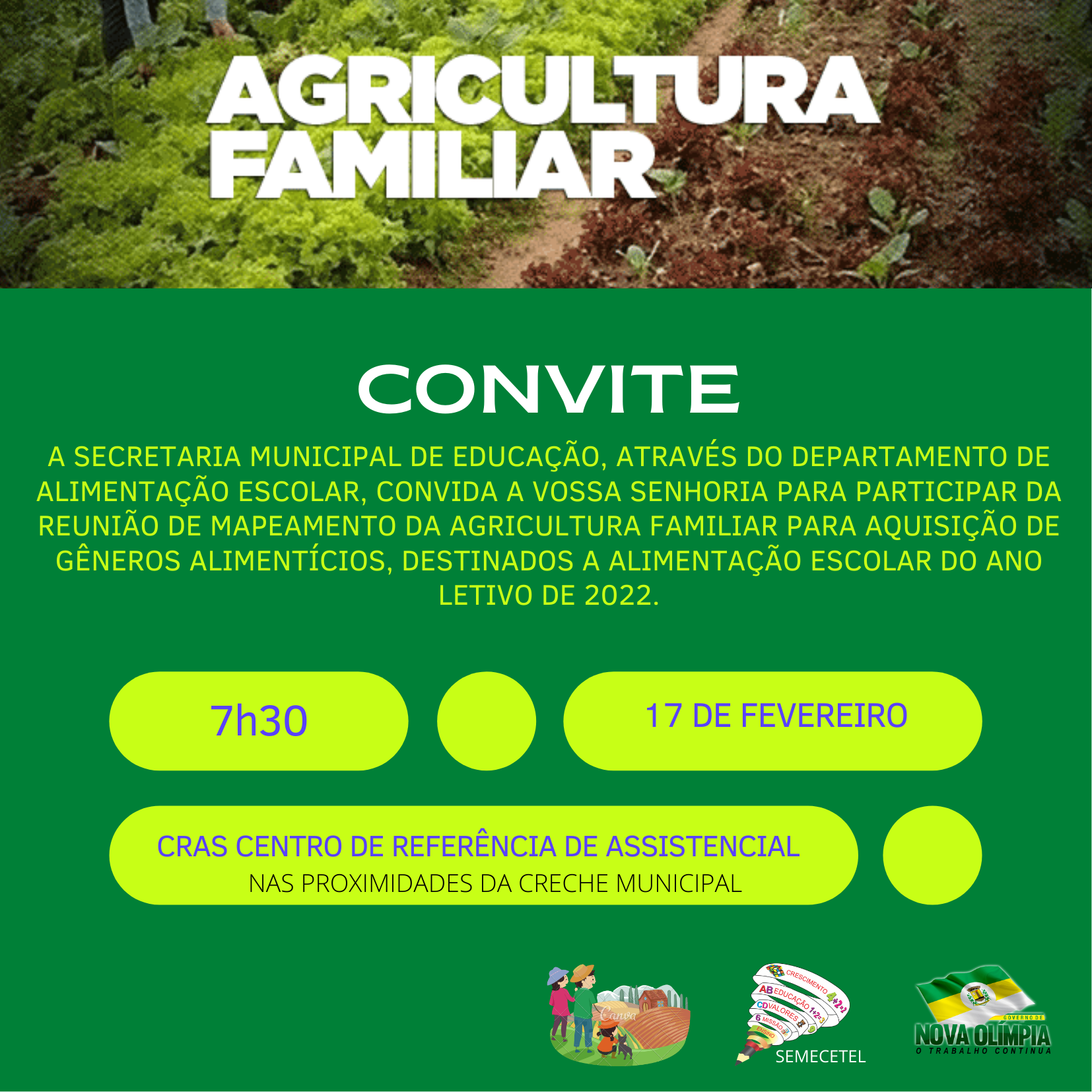 A Secretaria Municipal de Educação de Nova Olímpia-MT, através do Departamento de Alimentação, divulgou recentemente publicação em forma de convite, concedendo oportunidade para que agricultores familiares possam participar da reunião que será realizada às 07h30 do dia 17 de fevereiro de 2022, na sede do (CRAS), Centro de Referência de Assistência Social do Município, localizado na avenida Pedro Pedrossian nº 1549-S, Bairro Jardim das Oliveiras, nas proximidades da Creche Municipal.