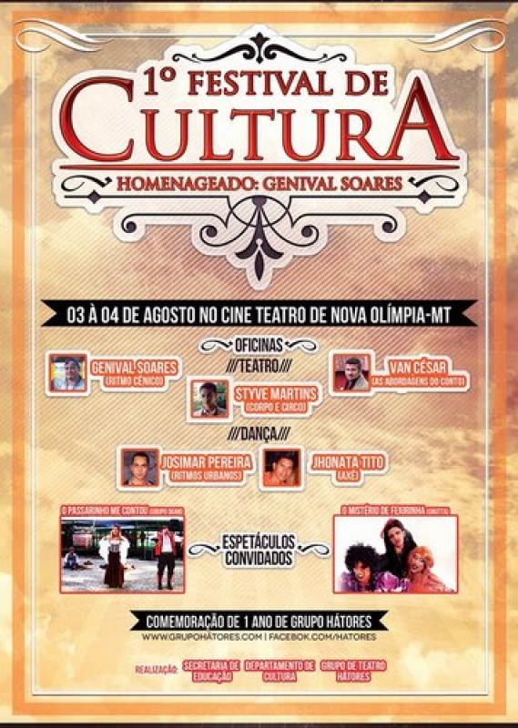 O Cine Teatro de Nova Olímpia servirá de palco neste final de semana, 03 e 04 para o 1º Festival de Cultura “Genival Soares”. O evento marca o primeiro aniversário do grupo de Teatro Hátores, mantido pelo Departamento de Cultura e homenageará o artista Genival Soares, um dos precursores do movimento cultural na cidade.