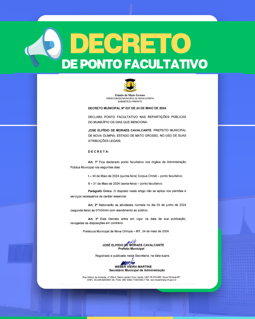O prefeito Municipal de Nova Olímpia, José Elpídio, acompanha decisão do Governo do Estado e decretando ponto facultativo nas repartições públicas municipais na quinta (30), dia em que será celebrado Corpus Christi, e sexta-feira (31). O Decreto n° 037 foi assinado pelo gestor e publicado no site oficial e nas redes sociais da Prefeitura.