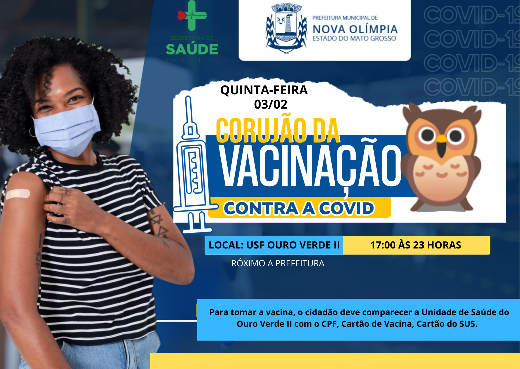A Secretaria Municipal de Saúde de Nova Olímpia, por meio da Vigilância em Saúde irá realizar nesta quinta-feira (03), das 17:00 às 23 horas, mais uma edição do Corujão da Vacinação no município. A ação de imunização vai ocorrer na USF Ouro Verde II, próximo a Prefeitura e vai ofertar vacinas para 1ª, 2ª e 3ª dose contra a covid-19.