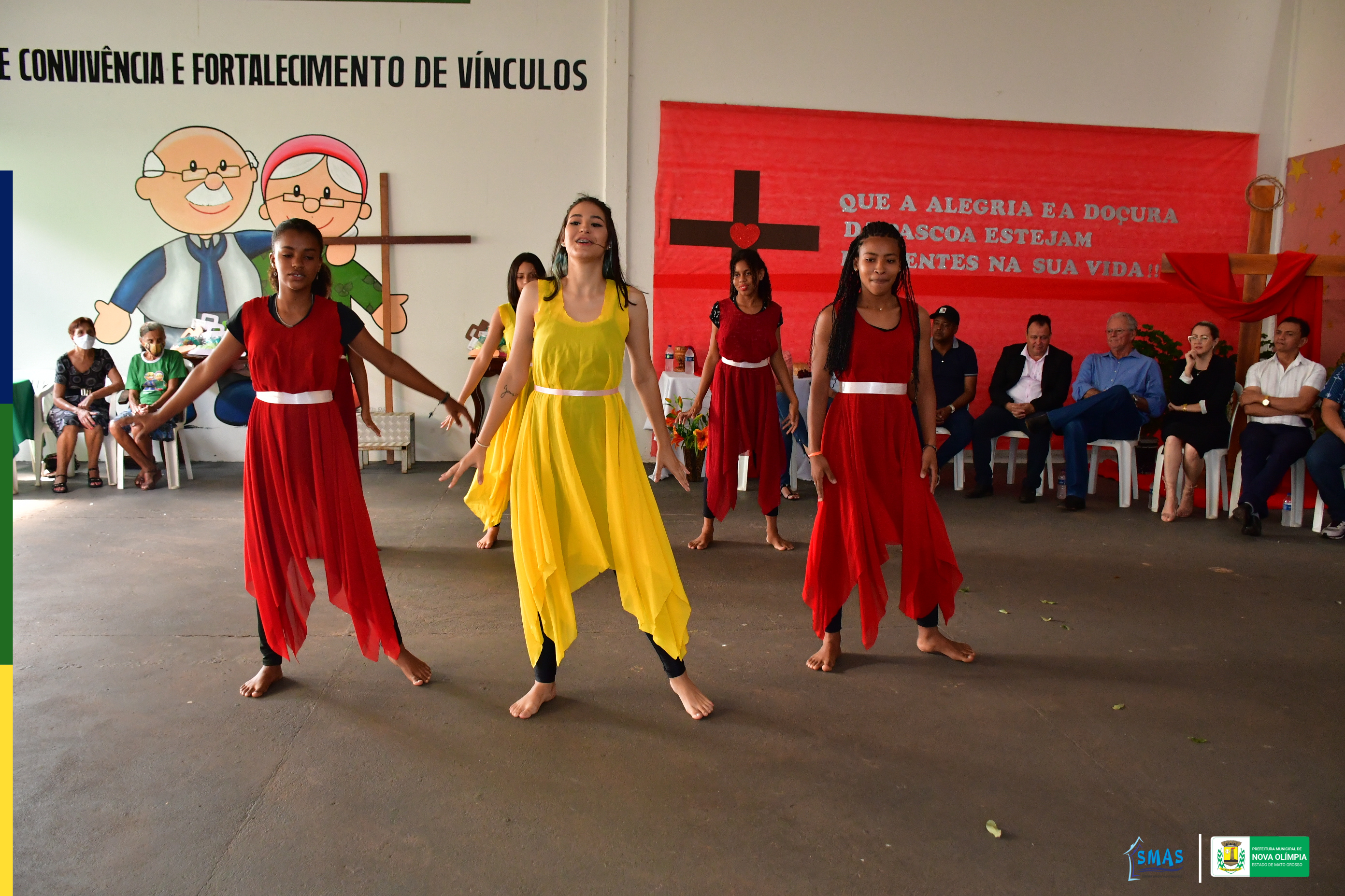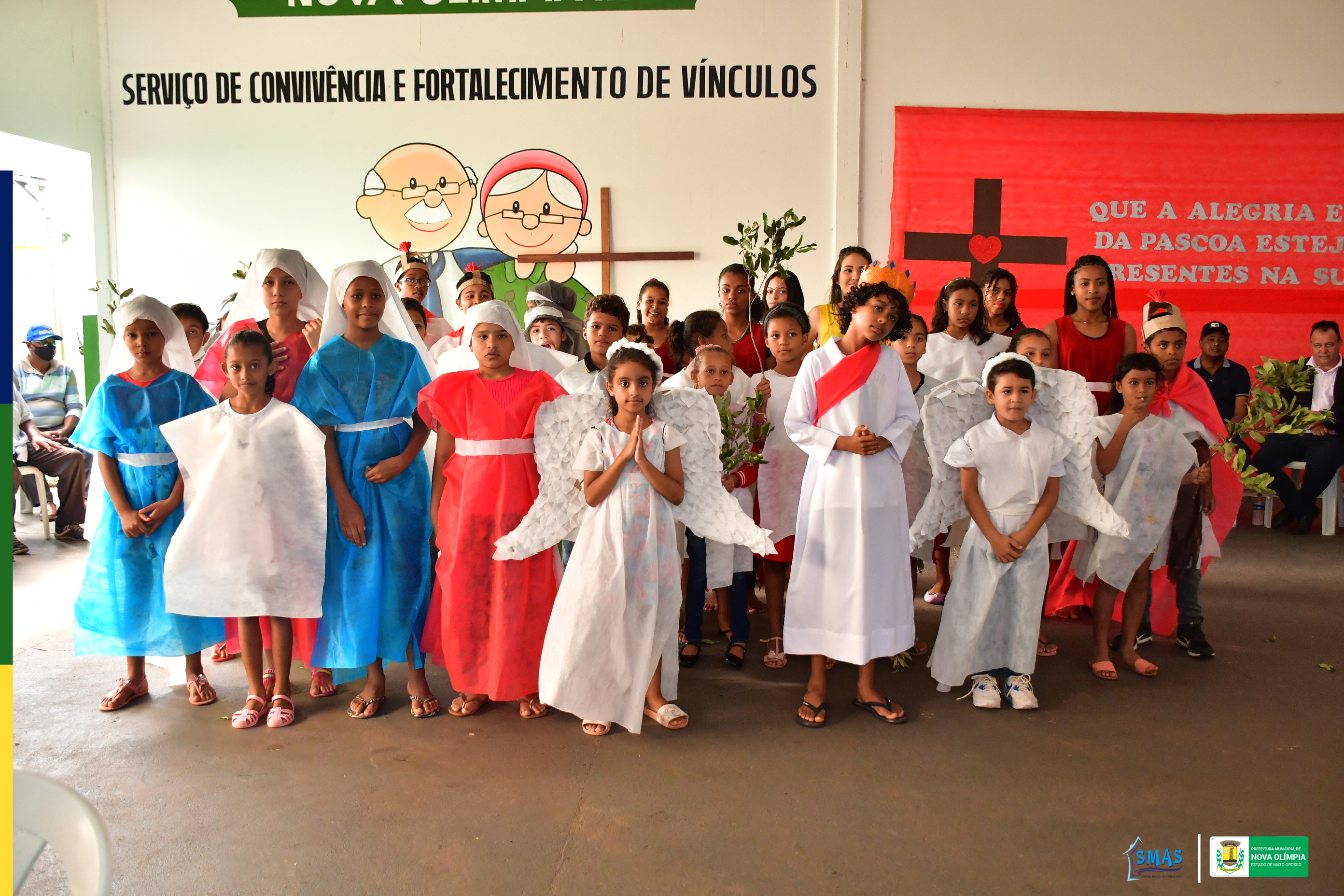 A programação contou com encenação da ressureição de Cristo, apresentação musical e entrega simbólica de ovos de pascoa para idosos e crianças do Serviço de Convivência e Fortalecimento de Vínculos da Secretaria de Assistência Social.