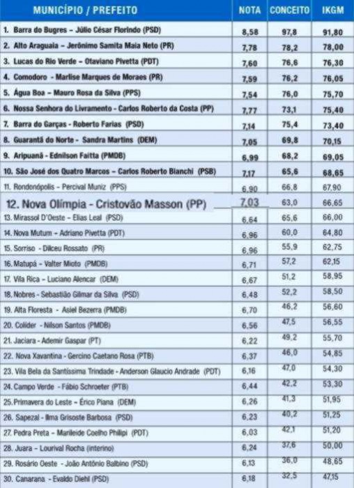 No ranking das cidades melhores avaliadas estão os prefeitos de Barra do Bugres, Júlio César Florindo, seguido de Maia Neto, de Alto Araguaia, Otaviano Pivetta, de Lucas do Rio Verde; Marlise Marques de Moraes, de Comodoro, e Mauro Rosa da Silva, de Água Boa.