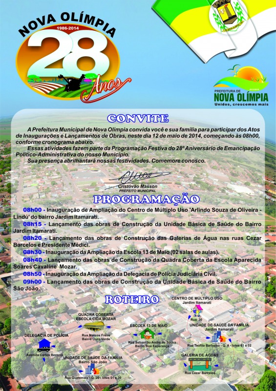 NOVA OLÍMPIA: 28 ANOS - Programação desta segunda será voltada para inaugurações e lançamentos de o