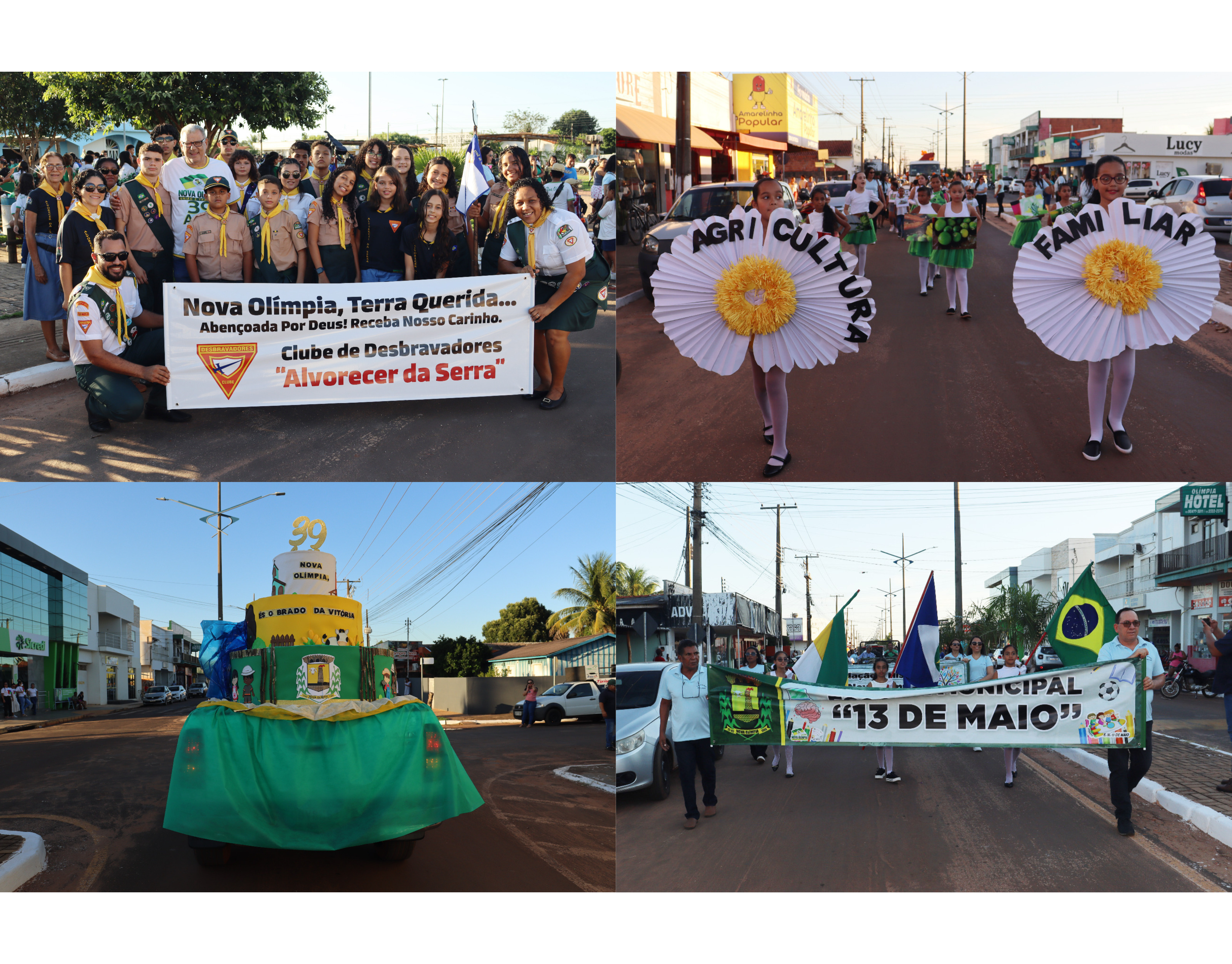 Nova Olímpia comemorou na quarta-feira (07) seus 39 anos de emancipação político-administrativa com um emocionante desfile cívico que percorreu as principais avenidas da cidade, encerrando no Centro de Eventos. O evento, que reuniu escolas da Rede Municipal e Estadual, secretarias municipais, programas parceiros e a comunidade local, celebrou a história e o desenvolvimento do município de uma forma especial e interativa.