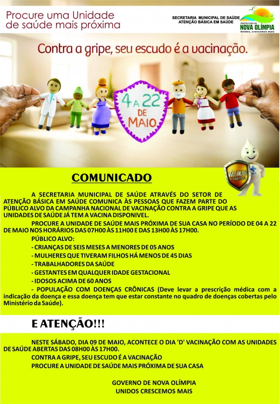 DIA ‘D’ - O dia 9 de maio (sábado) é considerado o dia mais importante da vacinação. Estarão funcionando as Unidades de Saúde dos bairros Boa Esperança, Ouro Verde I e II, São João e Centro. Nestas unidades, a vacinação no chamado "Dia D" ocorrerá das 08h00 às 17h00.