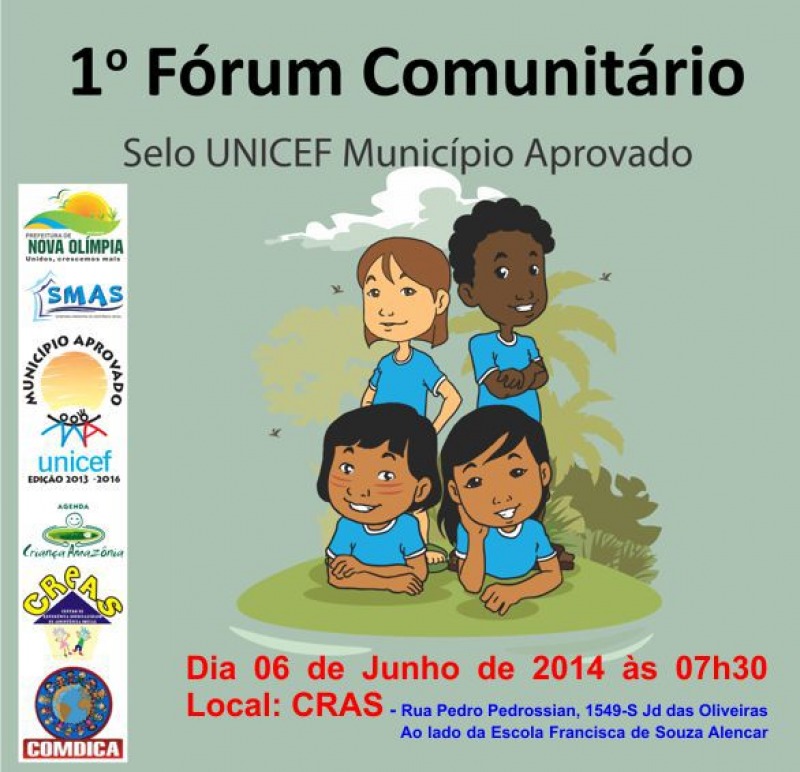 A prefeitura de Nova Olímpia, através da Secretaria Municipal de Assistência Social/CREAS realiza na próxima sexta-feira (06), o Fórum Comunitário do Selo UNICEF Município Aprovado (Edição – 2013/2016). O evento que vai reunir órgãos ligados à defesa dos direitos das crianças e adolescentes do município acontece a partir das 07h30 nas dependências do Centro de Convivência dos Idosos, na rua Pedro Pedrossian, 1549-S Jardim das Oliveiras (ao lado da escola Francisca Souza Alencar).