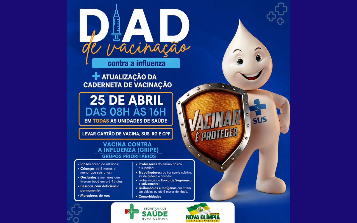 A Secretaria Municipal de Saúde de Nova Olímpia promove neste sábado, dia 25, o “Dia D” de vacinação, uma ação que visa ampliar a proteção da população contra a gripe. Todas as Unidades Básicas de Saúde (UBS) da área urbana, estarão abertas das 8h às 16h, sem intervalo, para atender moradores de todas as idades, especialmente aqueles pertencentes aos grupos de risco.