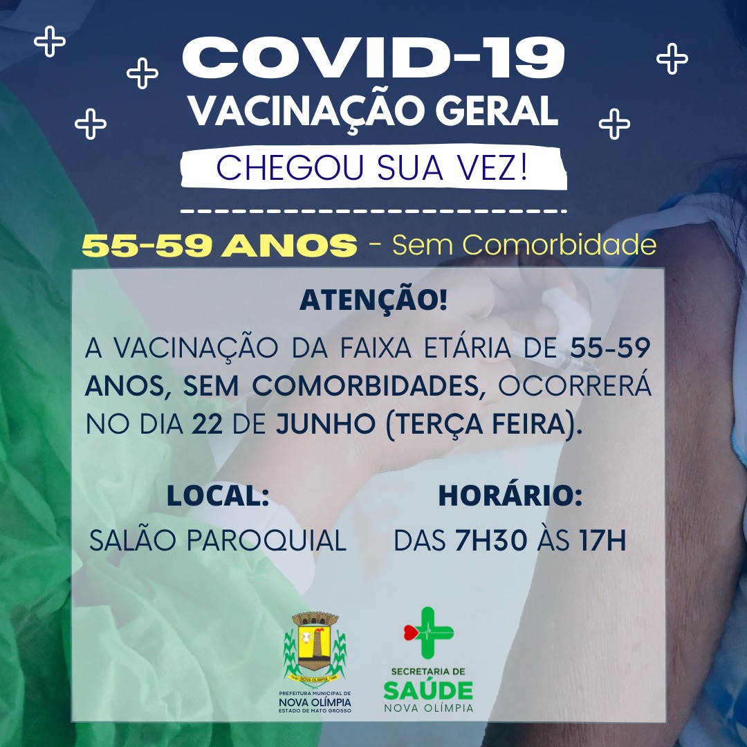 A Secretaria Municipal de Saúde de Nova Olímpia vai vacinar nesta-terça, (22) pessoas sem comorbidade que se enquadram dentro da faixa etária de 55 a 59 anos de idade. A Vacinação terá início às 07h30 da manhã no salão Paroquial da Igreja Matriz.