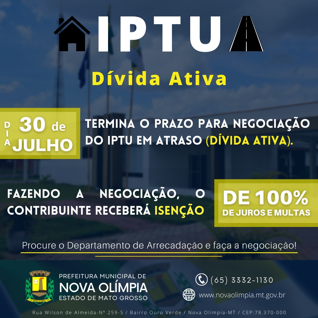Termina dia 30 o prazo para o pagamento do IPTU em atraso com desconto, concedido aos contribuintes em débitos da dívida ativa. Fazendo a negociação o contribuinte receberá isenção de 100% de juros e multas. A alternativa foi o meio que o governo municipal arrumou para conceder oportunidade de negociação aos munícipes.