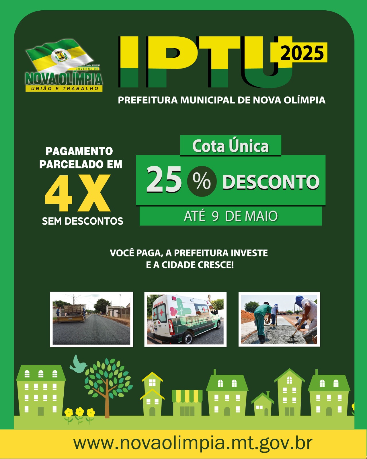 Enquanto isso, a Governo Municipal também iniciou a entrega dos carnês do Imposto Predial e Territorial Urbano (IPTU) 2025 nas residências de Nova Olímpia. Para os contribuintes que optarem por pagar o imposto à vista, um desconto de 25% está disponível, desde que o pagamento seja feito em cota única até o dia 9 de maio.