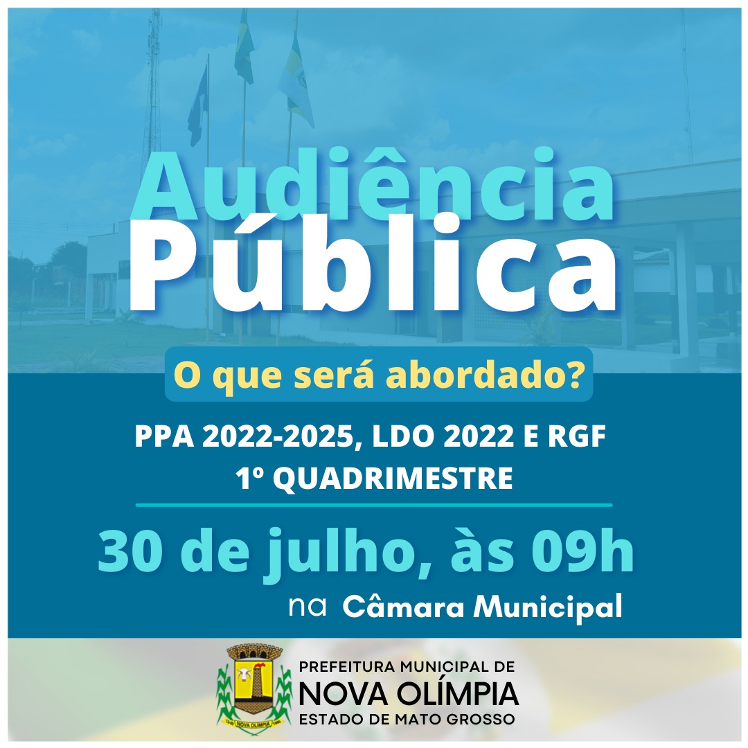 A Prefeitura Municipal de Nova Olímpia, nos termos do artigo 48, parágrafo único, da Lei Complementar Federal nº. 101, de 04 de maio de 2000, convida a população em geral para, através dos seus diversos seguimentos sociais, para participarem de duas Audiências Pública que serão realizadas as 09h da manhã no Auditório da Câmara Municipal, dia (30.07), na oportunidade serão apresentados; Projeto de Lei do -- Plano Plurianual – PPA 2022/2025, Projeto de Lei de Diretrizes Orçamentarias – LDO 2022, oportunidade em que também serão presentadas Relatório de Gestão Fiscal RGF do 1º quadrimestre de 2021.