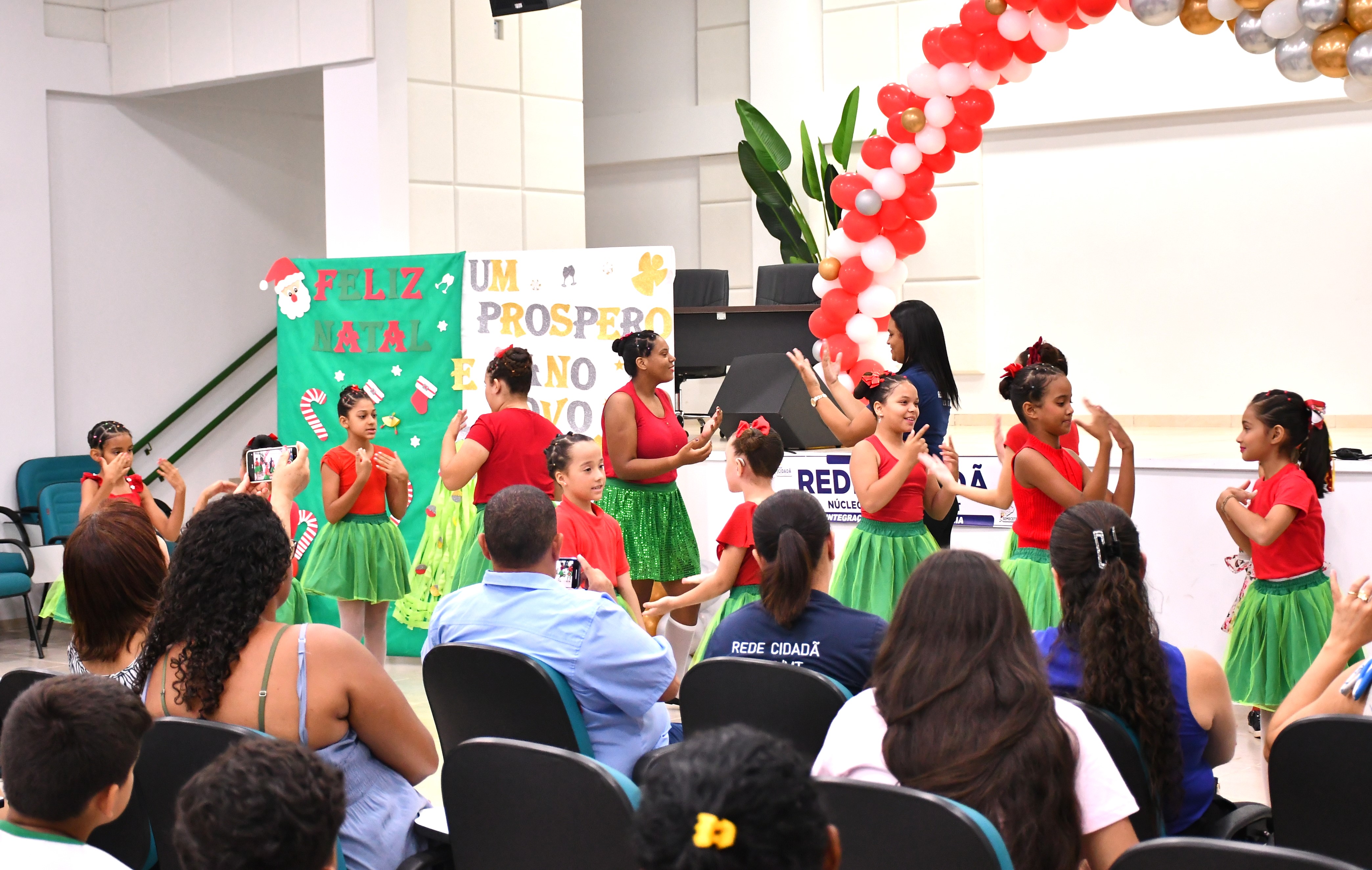 Durante a solenidade de encerramento, os convidados puderam prestigiar as apresentações das oficinas desenvolvidas ao longo do ano e a chegada do papai Noel e mamãe Noel.