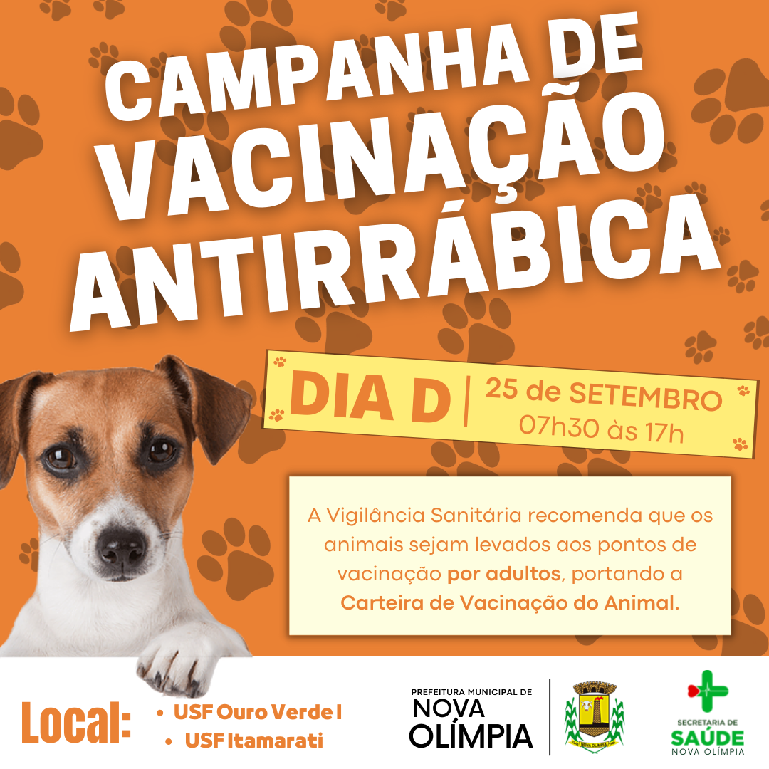 A Secretaria Municipal de Saúde, por meio da Vigilância Sanitária de Nova Olímpia vai realizar no próximo sábado dia (25), a campanha de vacinação antirrábica animal para cães e gatos de todos os bairros da cidade. Para ação de vacinação dois postos de atendimento serão disponibilizados, USF Ouro Verde I e USF Itamarati das 07h30 às 17h.